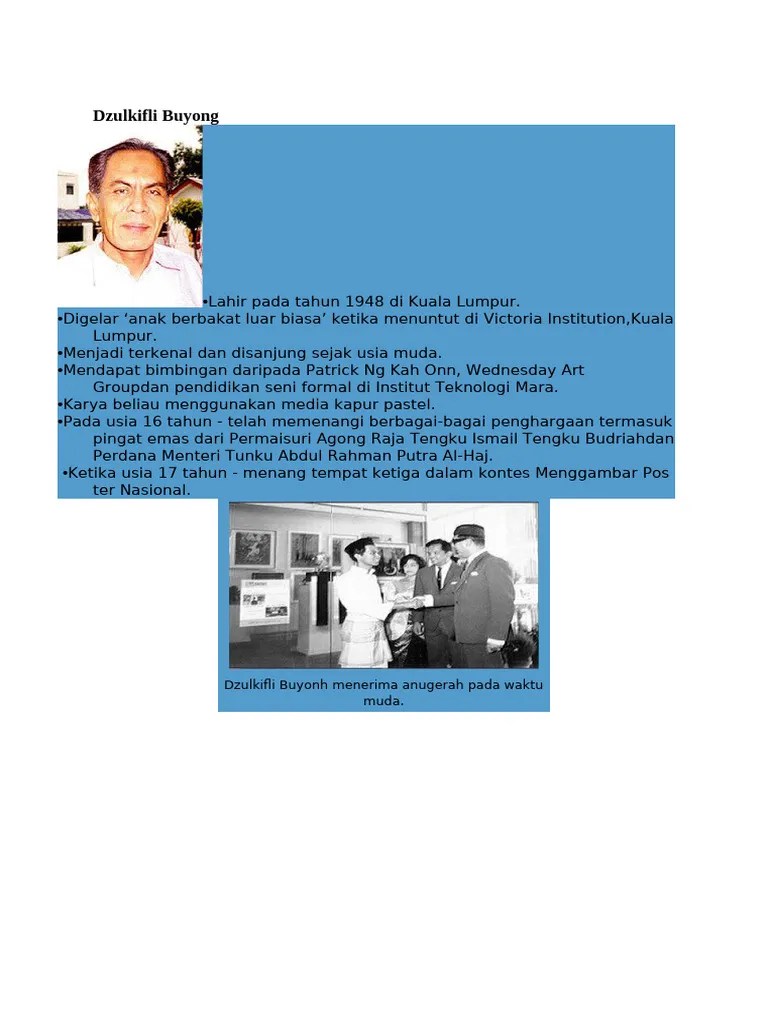 Mendapat bimbingan daripada patrick ng kah onn, wednesday art group dan pendidikan seni formal di institut teknologi mara. Karya beliau menggunakan media kapur pastel. Selain itu karya yang dihasilkan juga dalam suasana yang suram kerana menunjukkan waktu malam.pengkarya menampilkan figura dalam pelbagai sudut . Karya dzulkifli buyong · mesej yang hendak disampaikan · perahu kertas (1996) · mesej yang ingin disampaikan :. Dzulkilfi berjaya menangkap reaksi dan suasana . Dzulkilfi berjaya menangkap reaksi dan suasana melalui lukisan . Kajian karya catan dzulkifli buyong ini merupakan sebuah hasil kajian mengenai karya catan yang telah dihasilkan oleh beliau. Karya beliau menggunakan media kapur pastel. Dzulkifli buyong was renowned forportraying scenes from childhood and cats.the artist paints himself in this work with. Karya dzulkifli buyong · related · iklan atas artikel · iklan tengah artikel 1 · iklan tengah artikel 2 · iklan bawah artikel · recent images · blog .